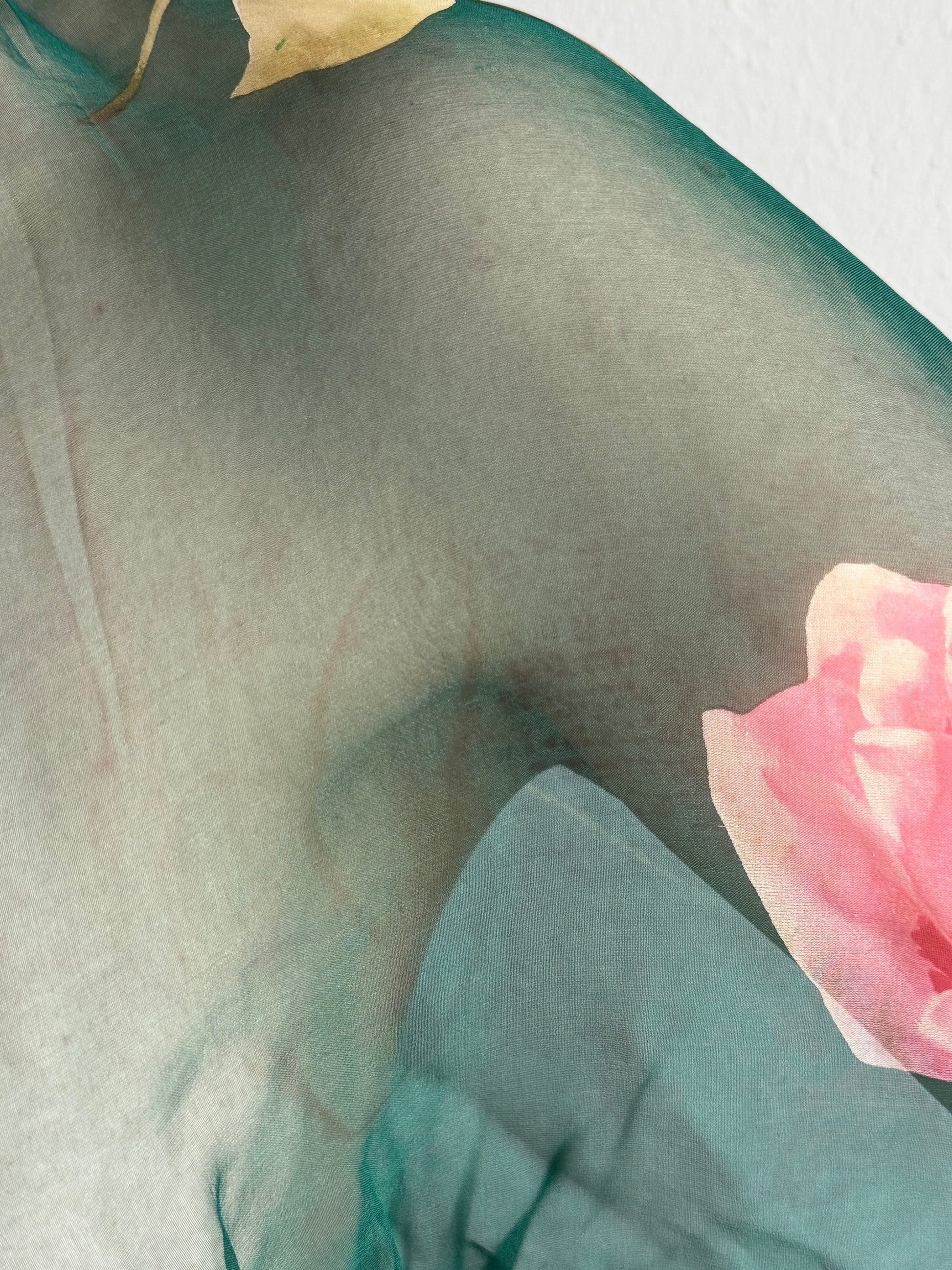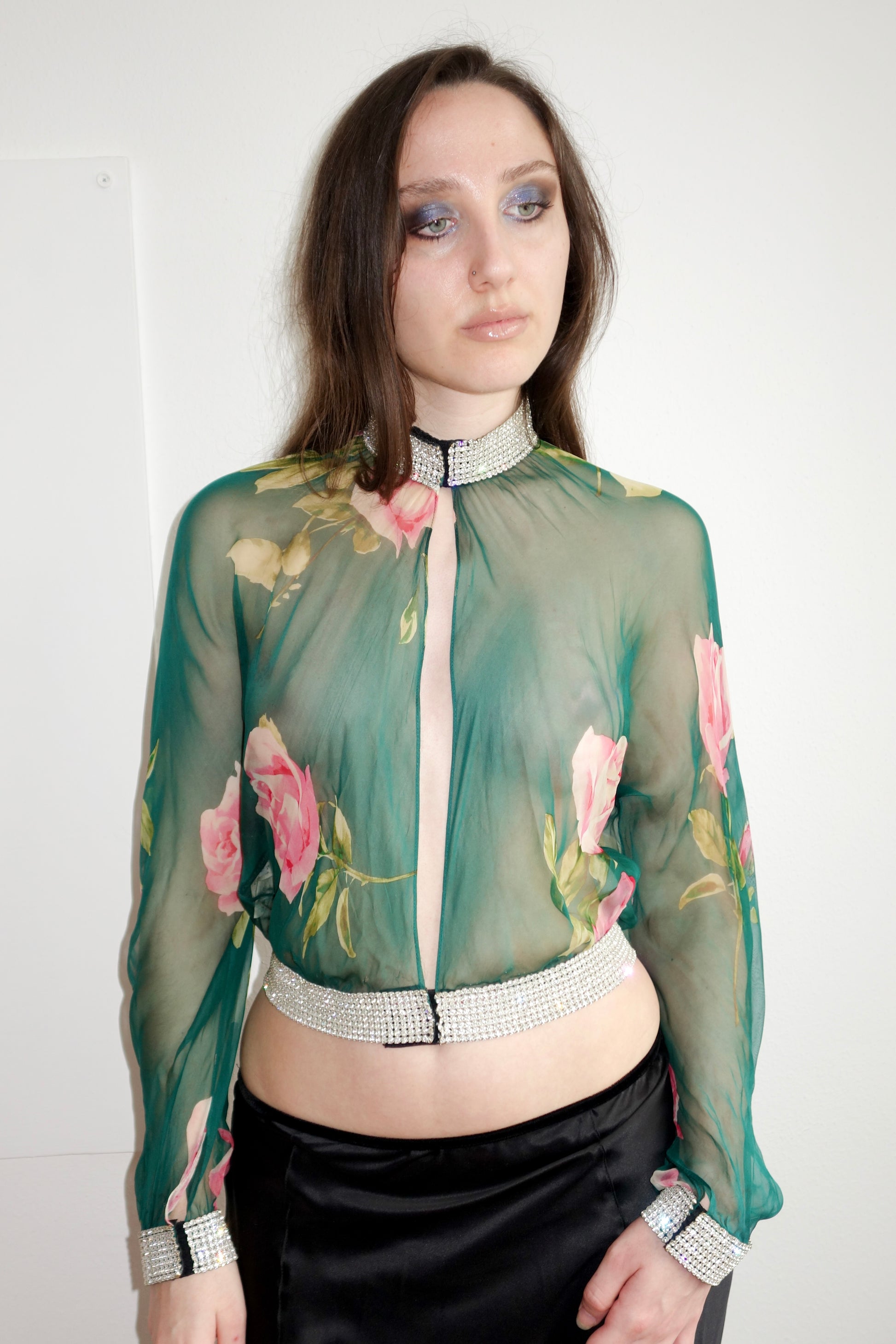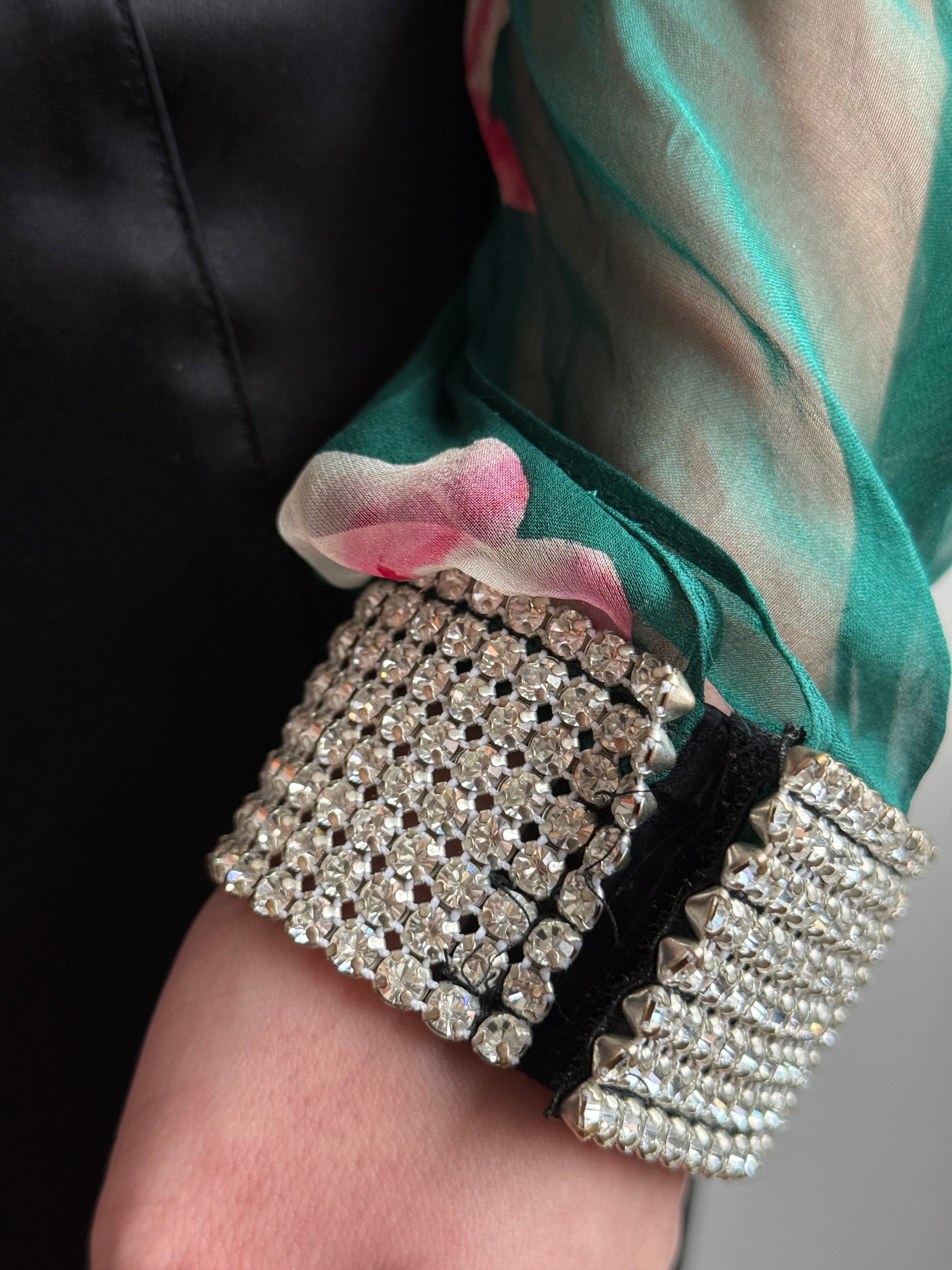 Dolce and Gabbana ss 2000 blouse. Painted silk and rhinestone cuffs. As seen on the runway. Size it 44. Shown on a size S. Waist measurements: 36 cm. Some wear on the silk as photographed.