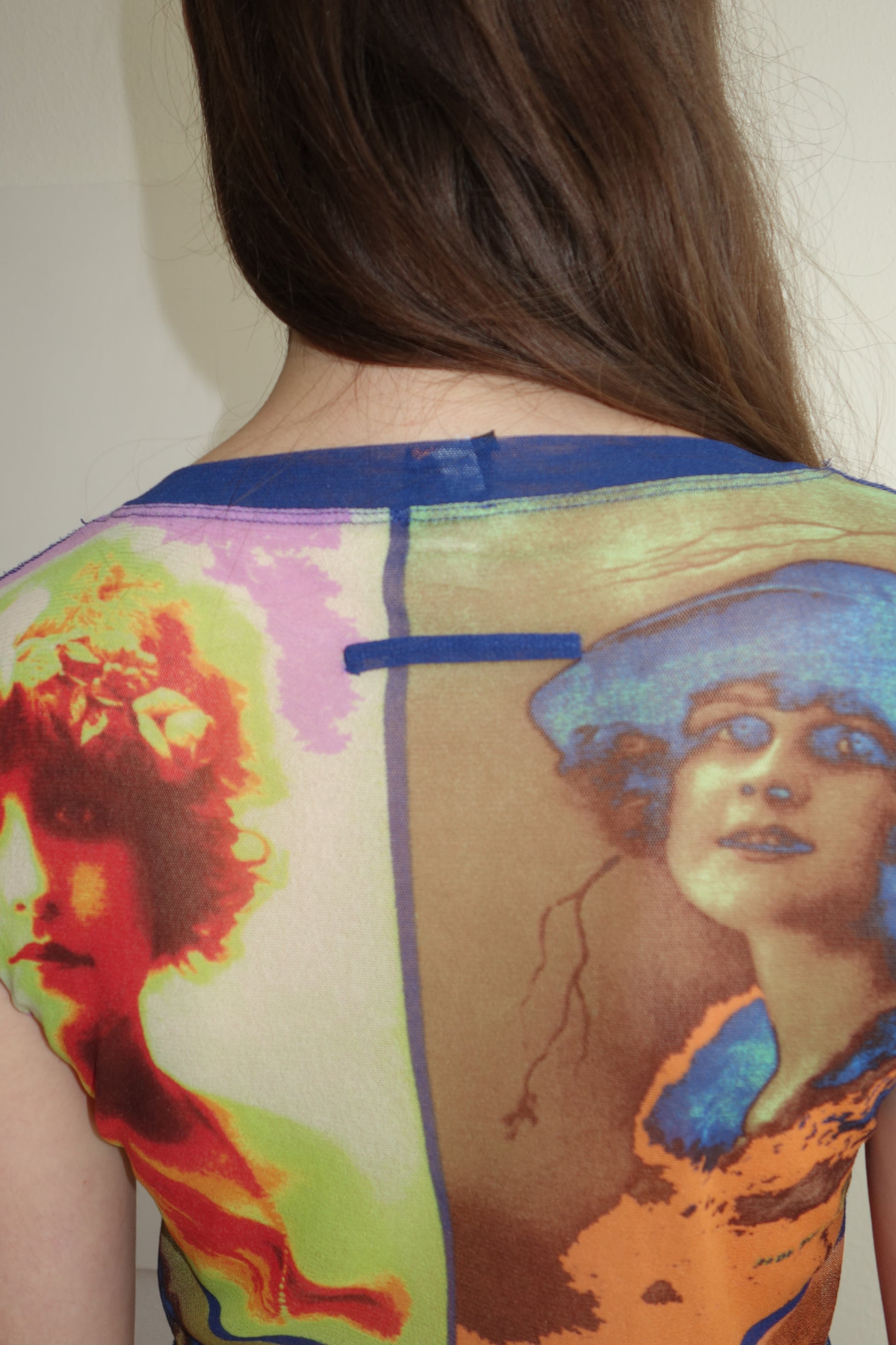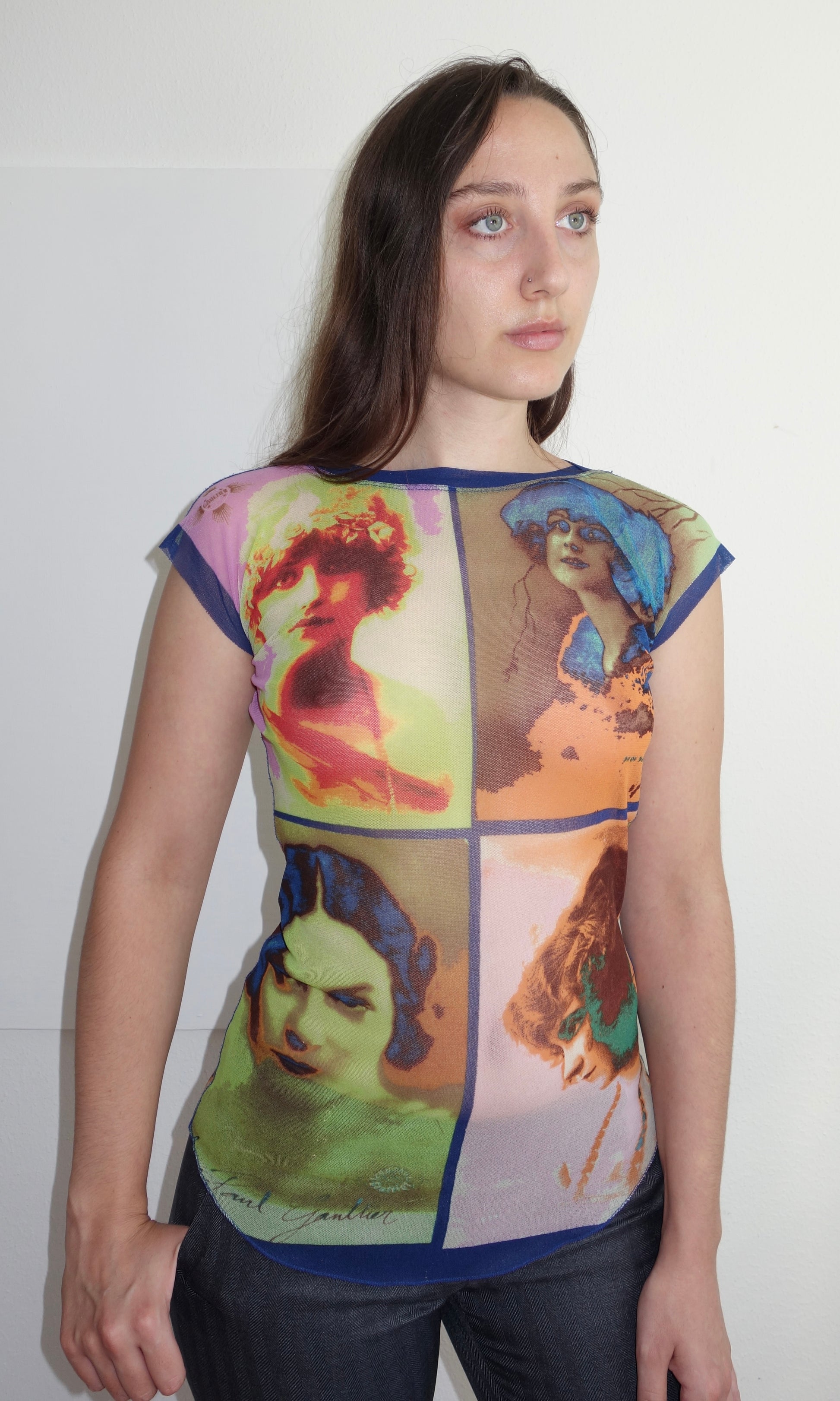 Jean Paul Gaultier ss 2002 mesh portrait top. Similar prints seen on the runway. Size labeled XL fits from S to XL as it is a stretchy mesh material.