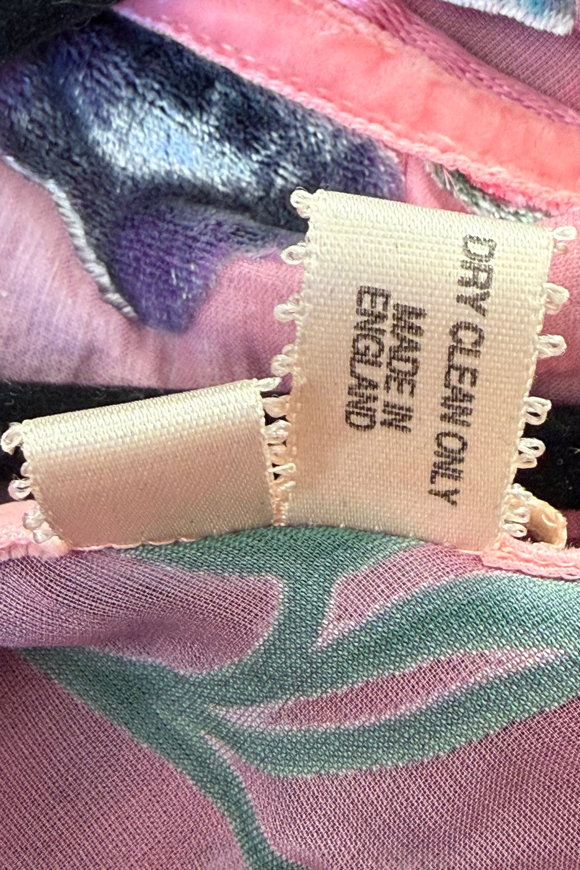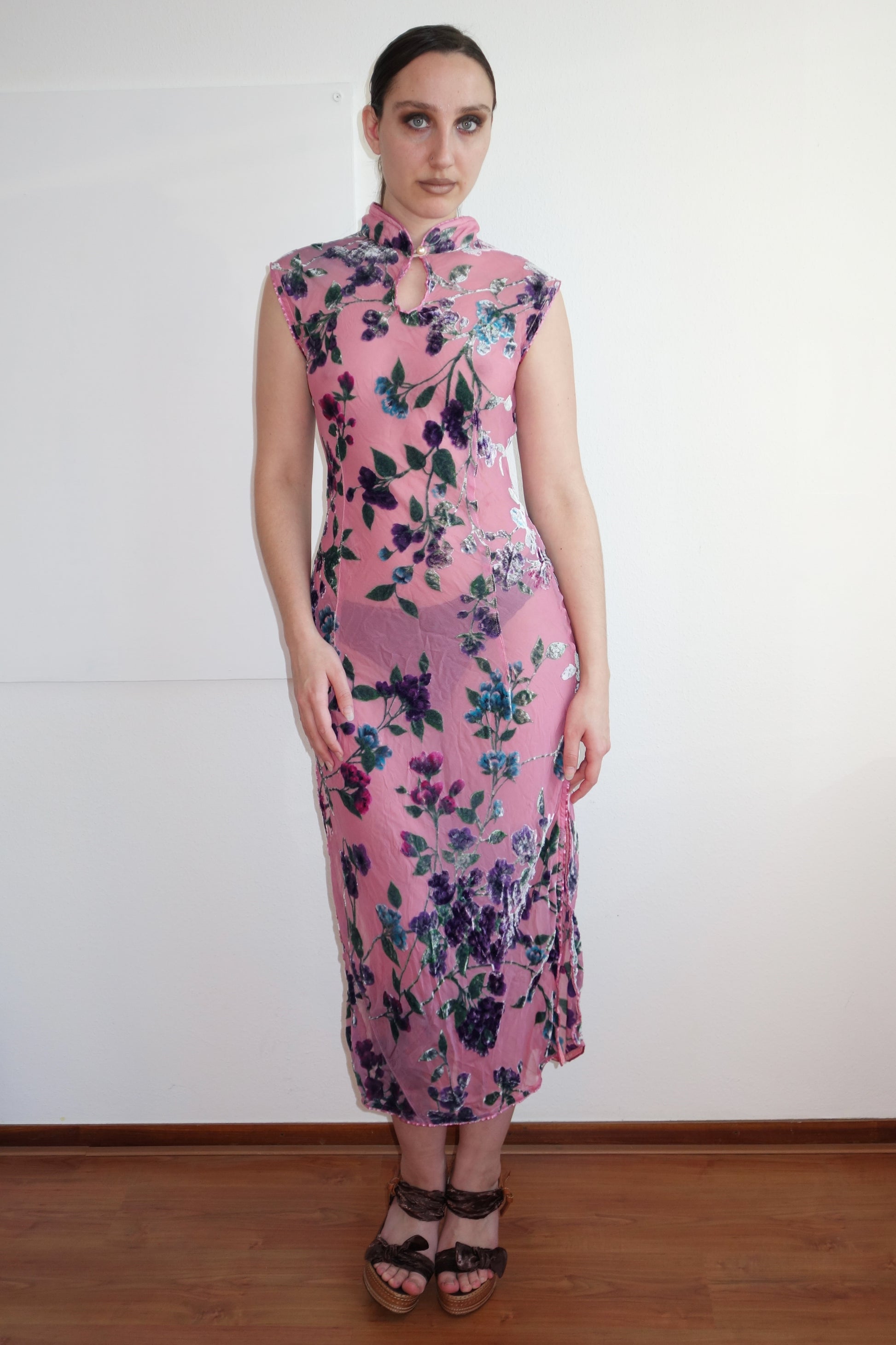 Voyage dress from the 90's. Pearl closure and velvet flowers all over the dress. Size L, shown on a size s/m. Measurements: shoulder to shoulder 43 cm, pit to pit 38 cm, waist 33 cm, hips 43 cm, length 127 cm. Stretchy material.